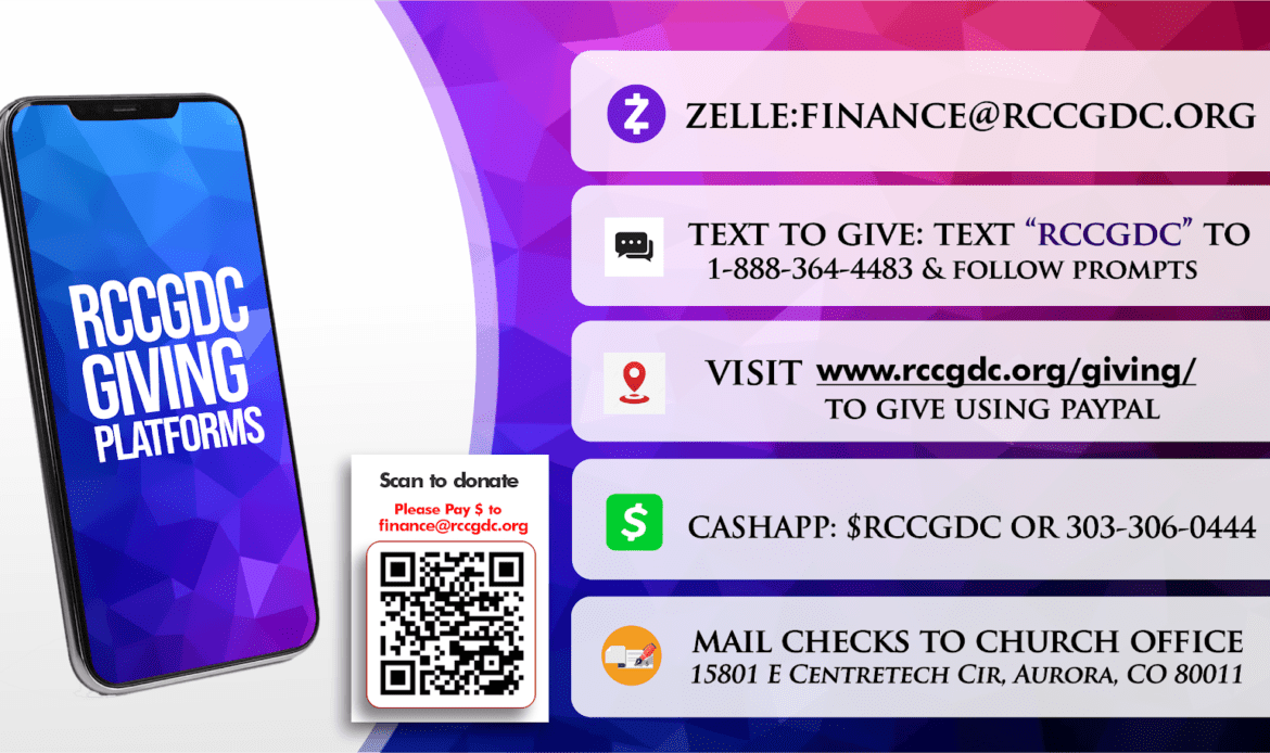 To give your offerings by text message, Text “RCCGDC” to 1-888-364-4483. Follow the prompts.